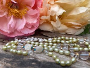 - zarte Mala aus - grünen und cremefarbenen Süßwasserperlen, - Bergkristall, - Perlmutterröschen auf Höhe des Herzchakras, eingefasst von türkis strahlendem Apatit. einfache Länge mit Quaste: 52cm Im Segen der Grünen Tara 🌿✨Sanft wie Wasser, klar wie…