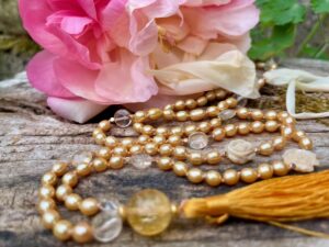 - Ich bin Sonne.Ich bin Freude.Ich bin Fülle. ✨ Diese zarte, verspielte Mala aus goldfarbenen Süßwasserperlen mit funkelndem Citrin und zarten Perlmutter-Röschen flüstert dir zu:Erinnere dich an dein Strahlen – jeden Tag, in jedem Atemzug. 🧡. einfache Länge mit Quaste: 52cm