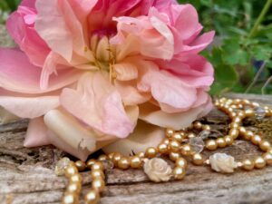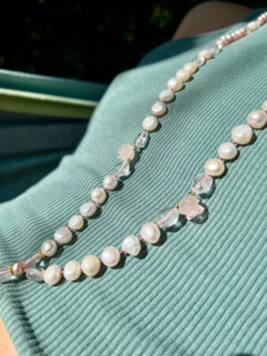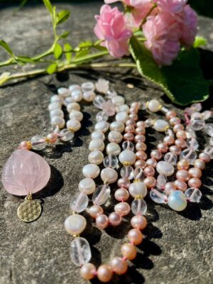 - „Sie will dich nicht verändern.Sie will dich erinnern –an das Spüren, an das Vertrauen, an deine weibliche Kraft.“ ✨ Yoni-Mala aus Süßwasserperlen rosé und crème, Bergkristall, Rosenquarz, Rosenquarz-Röschen & geschnitzter Yoni, Blume des Lebens vergoldet. …